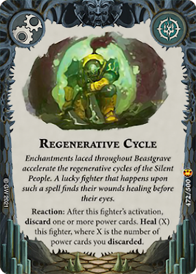 Veniel: Alors, je paye une amélioration qui ne fait rien du tout pour que quand mon combattant parvient à mettre hors de combat un adversaire, je puisse lui mettre une amélioration gratuite. Oui, il s’agit d’une très bonne carte. Si Underworlds était un jeu de campagne legacy et qu’on pouvait conserver ses améliorations d’une partie à une autre…Si au moins il y avait une condition alternative pour le mettre en jeu…genre avec des compteurs hunger puisque le mot est évoqué dans la citation…